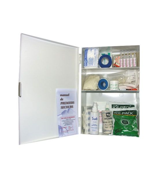 Composition : 20 pansements détectables 72 x 19mm, 20 pansements détectables papillons 7.5 x 4.6 cm, 20 pansements détectables articulations 8.5 x 4.5 cm, 1 sparadrap bleu 2 cm x 5 m, 1 bande crêpe 4m x 7cm, 1 bande de gaze 3m x 5cm, 1 bande de gaze 3m x 7cm, 5 compresses stériles 20 x 20cm, 5 compresses stériles 30 x 30cm, 20 sutures adhésives,1 panse-doigt bleu, 1 bande cohésive bleue 4.5 m x 2.5 cm, 2 poches de froid instantané, 2 pansements compressifs, 2 pansements tulle gras, 1 gel brûlure 50 ml, 5 dosettes sérum physiologique, 10 doigtiers latex roulé, 3 paires de gants, 1 couverture de survie, 1 écharpe triangulaire, 1 paire de ciseaux, 1 pince à échardes, 12 épingles de sûreté, 1 antiseptique chlorhexidine Vapo 100ml, 1 manuel 1er secours