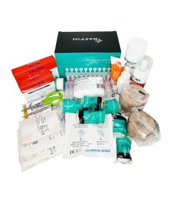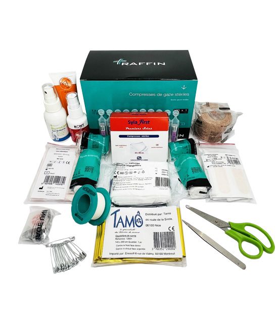 Petites blessures : 1 pansement à découper 1m x 6cm, 20 pansements assortis, 10 compresses stériles 5cm x 5cm, 100 compresses non tissées non stériles 7.5cm x7.5cm, 1 sparadrap microporeux 5 m x 2cm, 1 antiseptique chlorhexidine 50 ml, 1 gel brûlures spray 50 ml, 10 dosettes de sérum physiologique, 1 crème Arnica 50 ml,