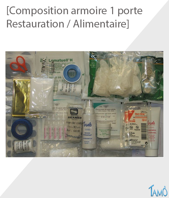 - Composition : 20 pansements détectables 72 x 19mm, 20 pansements détectables papillons 7.5 x 4.6 cm, 20 pansements détectables articulations 8.5 x 4.5 cm, 1 sparadrap bleu 2 cm x 5 m, 1 bande crêpe 4m x 7cm, 1 bande de gaze 3m x 5cm, 1 bande de gaze 3m x 7cm, 5 compresses stériles 20 x 20cm, 5 compresses stériles 30 x 30cm, 20 sutures adhésives, 1 bande cohésive bleue 4.5 m x 2.5 cm, 2 poches de froid instantané, 2 pansements compressifs, 2 pansements tulle gras, 1 gel brûlure 50 ml, 5 dosettes sérum physiologique, 10 doigtiers latex roulé, 3 paires de gants, 1 couverture de survie, 1 écharpe triangulaire, 1 paire de ciseaux, 1 pince à échardes, 12 épingles de sûreté, 1 antiseptique chlorhexidine Vapo 100ml, 1 manuel 1er secours