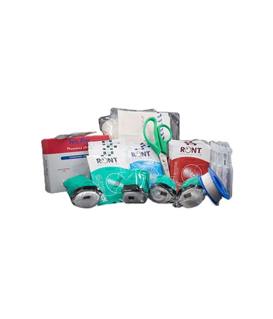 1 sparadrap 5 m x 2.5 cm,10 compresses stériles 5cm x 5cm, 20 pansements assortis, 10 dosettes sérum physiologique, 10 serviettes désinfectantes chlorhexidine, 10 serviettes coups et chocs.