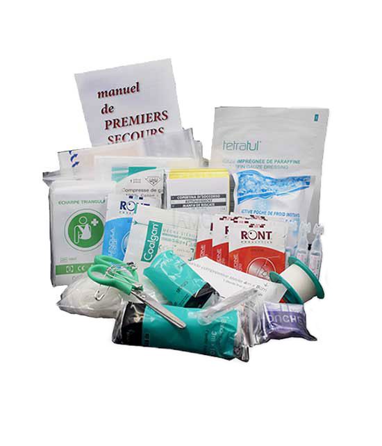1 pansement compressif, 1 sac de froid instantané, 10 pansements individuels assortis, 5 compresses stériles 7.5cm x 7.5 cm, 1 sparadrap 5 m x 2 cm, 1 dose de gel brûlures, 10 serviettes chlorhexidine, 3 dosettes 5 ml sérum physiologique, 2 tampons hémostatiques Coalgan, 3 serviettes coups et chocs.