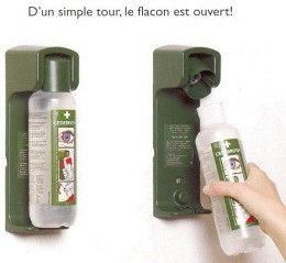 - Flacon individuel 500 ml facile à saisir et à utiliser seul ou en complément d’une station de lavage oculaire.