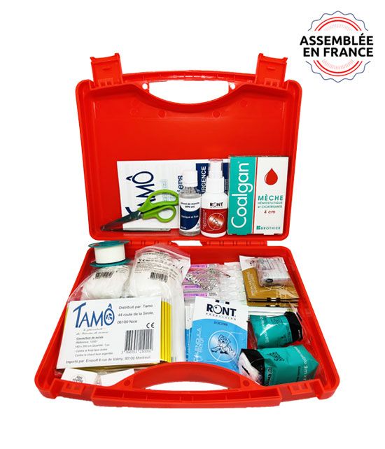 10 pansements assortis, 1 antiseptique chlorhexidine Vapo 50ml, 5 dosettes de sérum physiologique, 3 serviettes Calendula, 1 sac de froid instantané 10x10cm, 4 gants vinyl, 1 sparadrap microporeux 2.5cm x 5m, 5 compresses stériles 5x5, 1 boîte de coalgan 5 mèches, 1 flacon de menthe 30ml, 3 sucres enveloppés.
