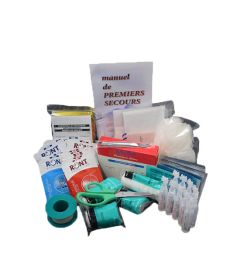 - Petits soins : 10 compresses stériles 5 x 5 cm, 20 pansements assortis, 1 sparadrap microporeux 2 cm x 5 m, 10 serviettes chlorhexidine, 10 serviettes coups et chocs, 10 sachets gel antibactérien, 10 dosettes sérum physiologique,